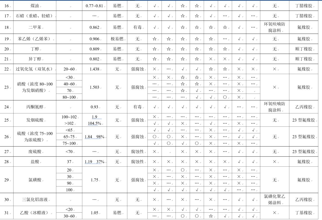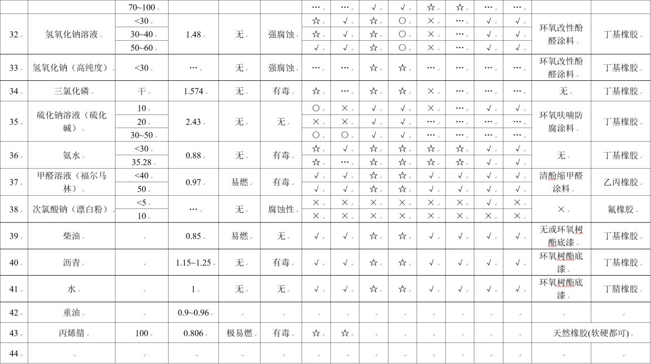 (1).罐體材料相容性符號(hào)含義:☆優(yōu)良;√良好;○可用但腐蝕較重;×不適用;…未知 (與溶體濃度、環(huán)境溫度有關(guān));