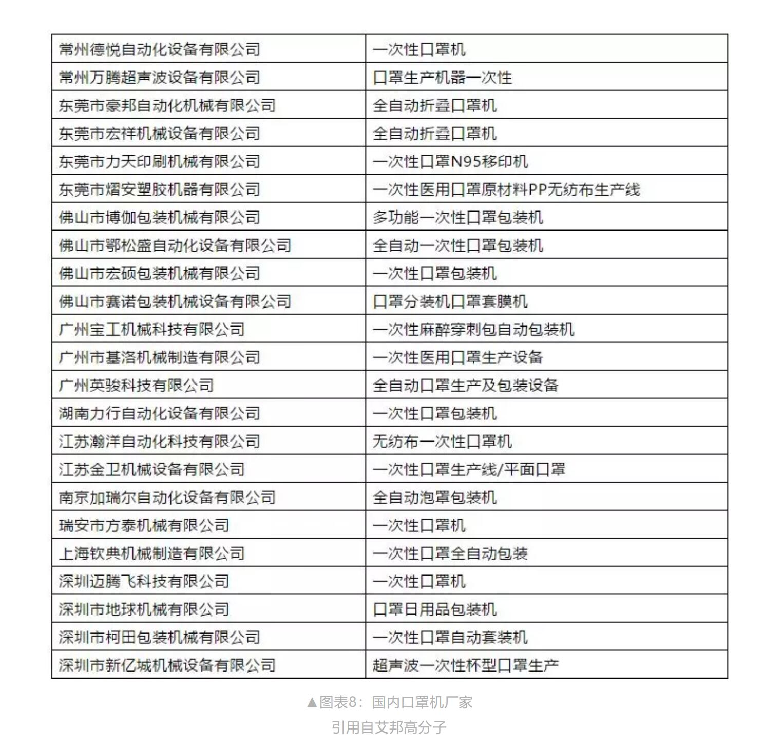口罩機廠家大部分在東莞。(東莞利瀚,東莞創(chuàng)煜,東莞粵藝順,東莞快裕達,東莞橫銳,南方力勁,廣東斯瑞凱),主要廠家名單如圖表8所示。
