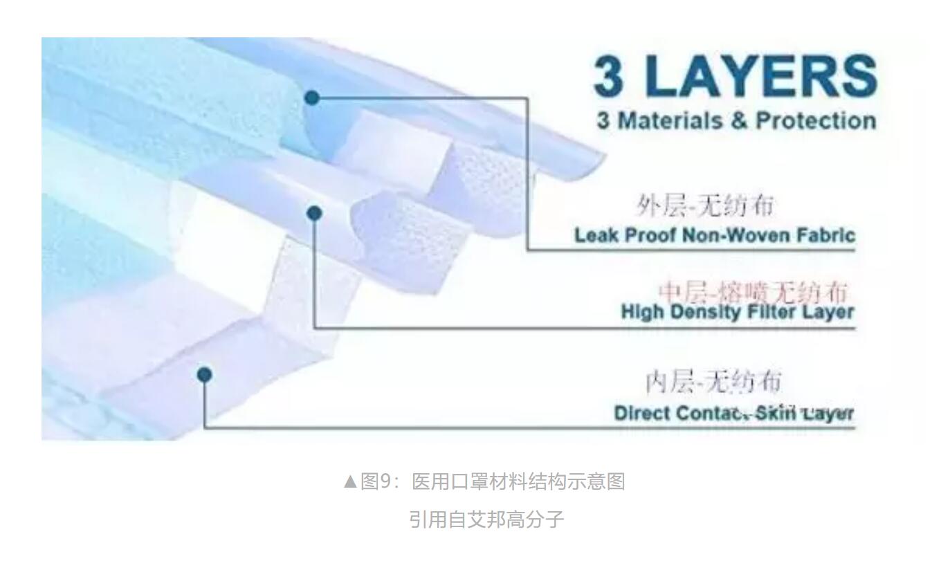 醫(yī)用外科口罩一般是由三層無紡布制成,如圖8所示。材料是紡粘無紡布+熔噴無紡布+紡粘無紡布(如圖9),起過濾效果的主要部分是極細密且?guī)ъo電的內(nèi)層過濾布——熔噴無紡布,它的主要材質(zhì)是高熔指聚丙烯,經(jīng)過靜電駐極處理后達到所要求的過濾效率。