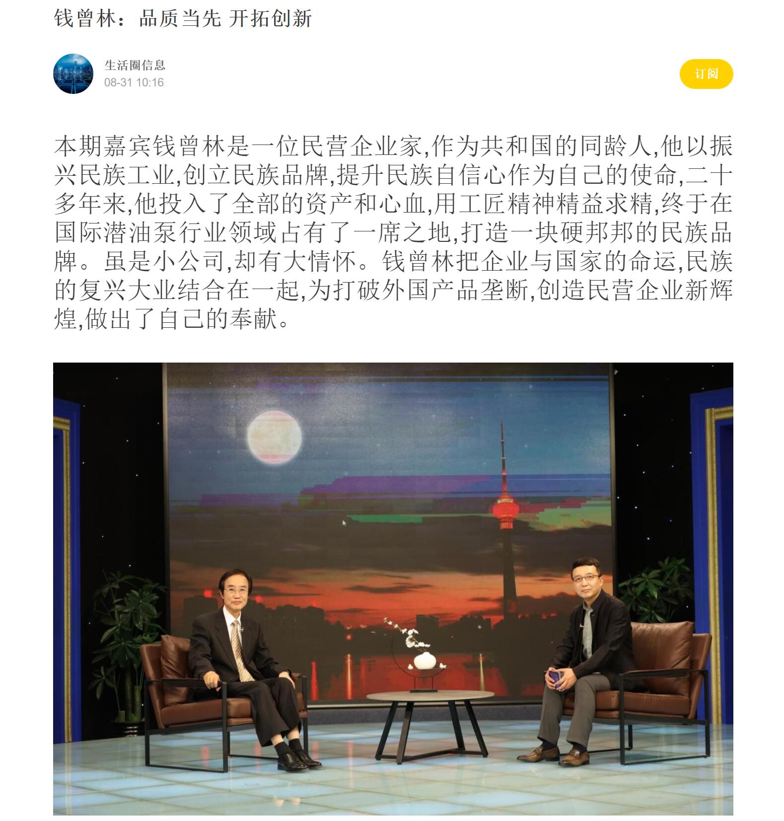 本期嘉賓錢曾林是一位民營(yíng)企業(yè)家,作為共和國的同齡人,他以振興民族工業(yè),創(chuàng)立民族品牌,提升民族自信心作為自己的使命,二十多年來,他投入了全部的資產(chǎn)和心血,用工匠精神精益求精,終于在國際潛油泵行業(yè)領(lǐng)域占有了一席之地,打造一塊硬邦邦的民族品牌。雖是小公司,卻有大情懷。錢曾林把企業(yè)與國家的命運(yùn),民族的復(fù)興大業(yè)結(jié)合在一起,為打破外國產(chǎn)品壟斷,創(chuàng)造民營(yíng)企業(yè)新輝煌,做出了自己的奉獻(xiàn)。