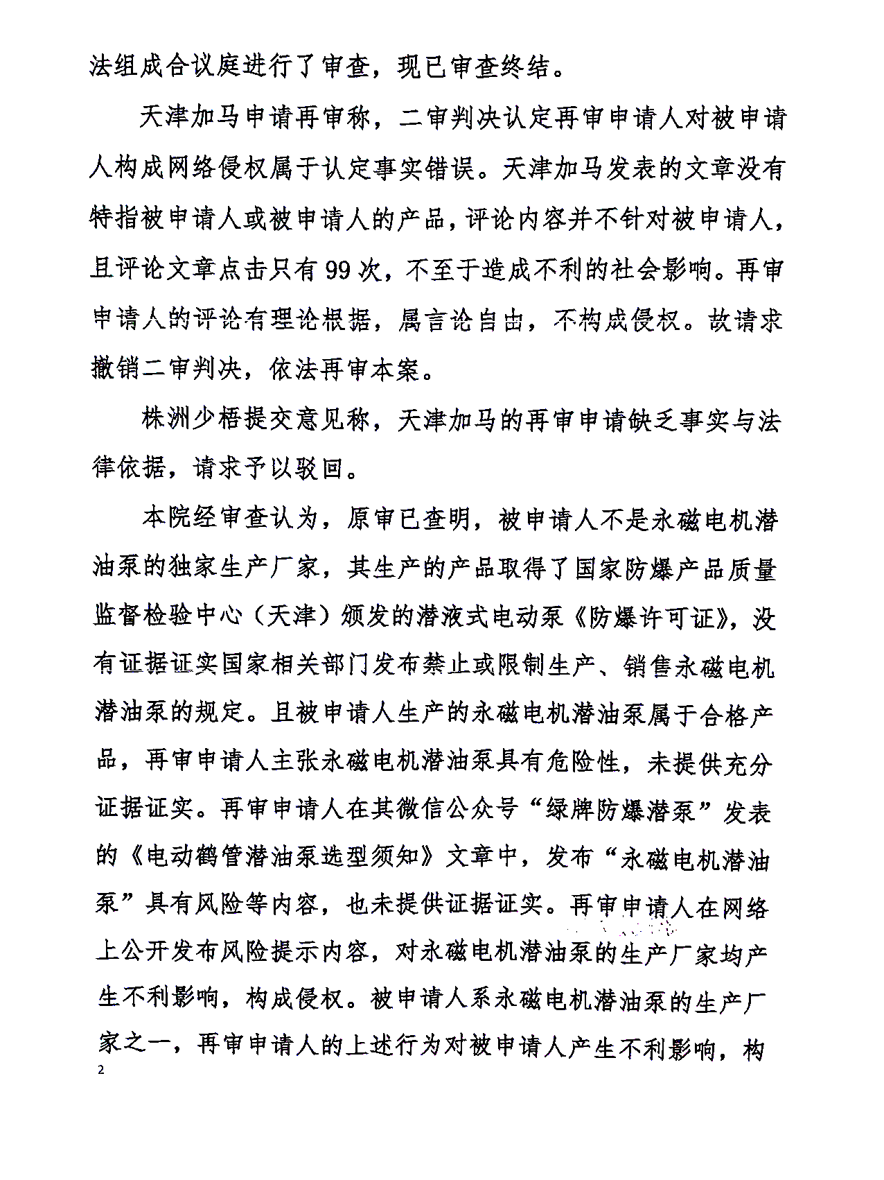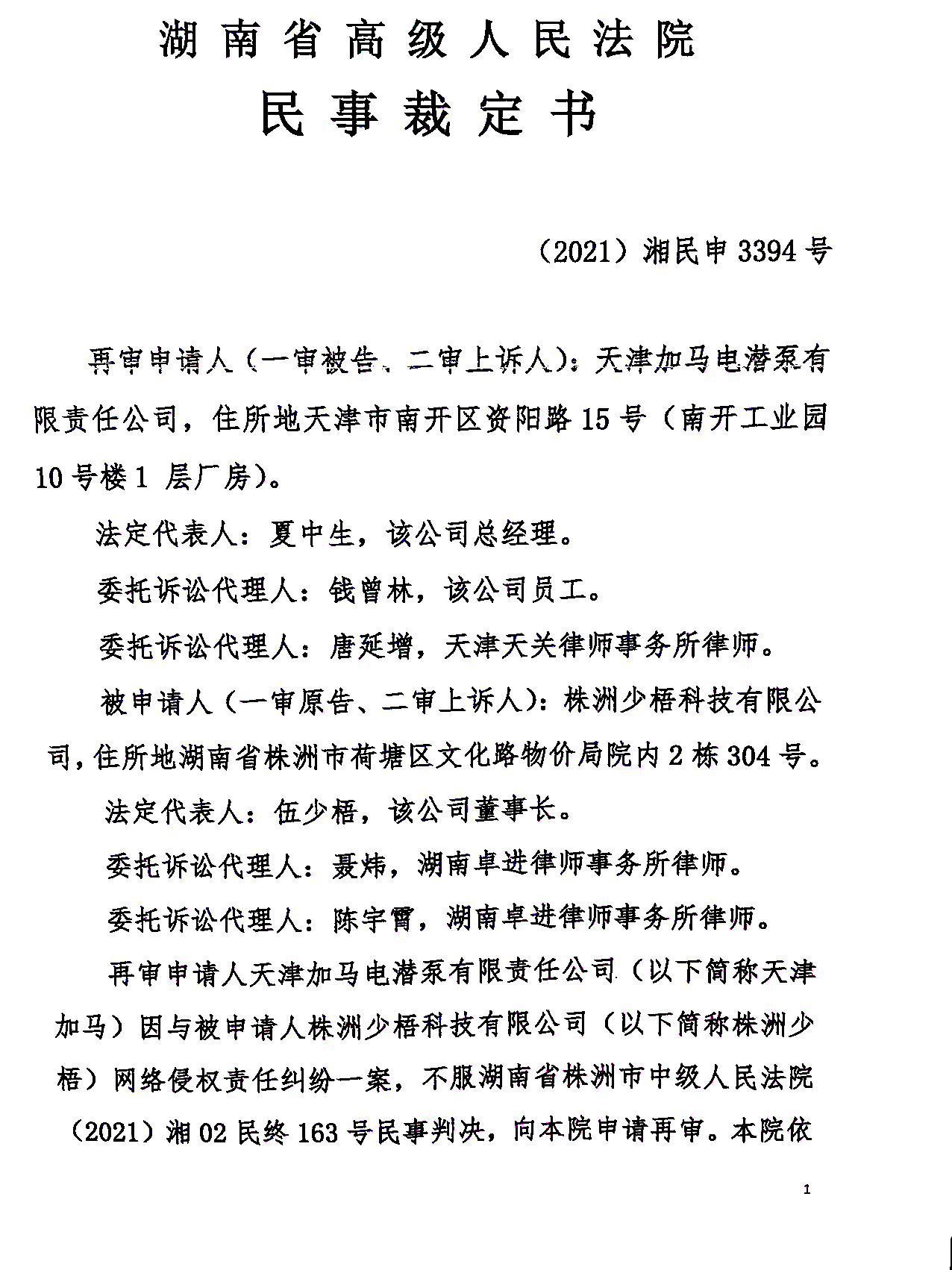 再審申請(qǐng)人天津加馬電潛泵有限責(zé)任公司(以下簡稱天津加馬)因與被申請(qǐng)人株洲少梧科技有限公司(以下簡稱株洲少梧)網(wǎng)絡(luò)侵權(quán)責(zé)任糾紛一案,不服湖南省株洲市中級(jí)人民法院(2021)湘02民終163號(hào)民事判決,向本院申請(qǐng)?jiān)賹?。本院依法組成合議庭進(jìn)行了審查,現(xiàn)已審查終結(jié)。