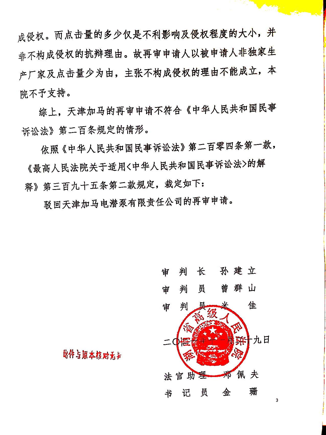 依照《中華人民共和國民事訴訟法》第二百零四條第一款,《最高人民法院關(guān)于適用<中華人民共和國民事訴訟法>的解釋》第三百九十五條第二款規(guī)定,裁定如下:駁回天津加馬電潛泵有限責(zé)任公司的再審申請(qǐng)。